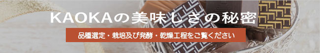 KAOKAは、カカオ豆の栽培からチョコレートの製造までのプロセスにおいて、オーガニック製法を中心としたノウハウを持っており、そのこだわりが、限られた原産地から集められたカカオ豆の持つ、力強い風味と、凝縮された芳香をチョコレートにもたらしています。